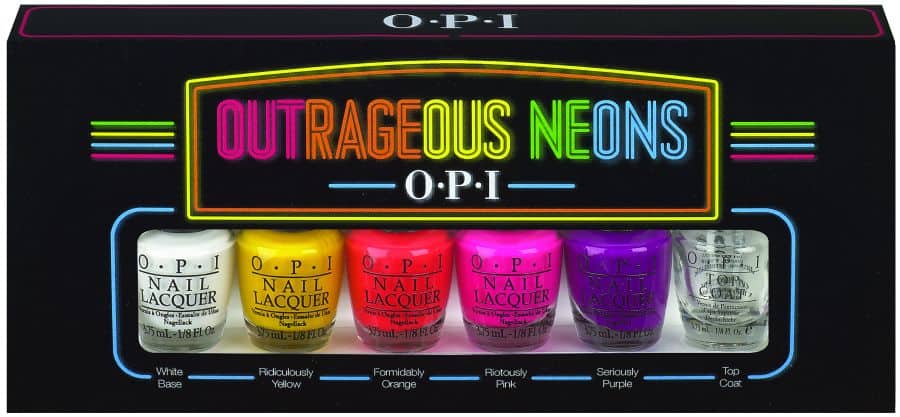 Cet été, OPI présente une collection si brillante que vous aurez certainement besoin de nuances, la mini collection « Outrageous Neons ». Composée de quatre teintes électriques, – Riotously Pink, Ridiculously Yellow, Formidably Orange, and Seriously Purple – ces couleurs doivent être appliquées sur la base blanche incluse dans le jeu pour vraiment faire de chaque nuance un fluorescent toujours plus pop!